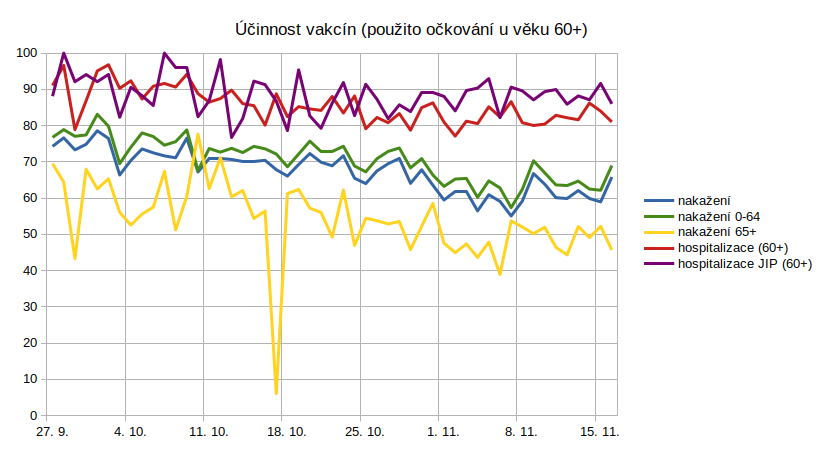 V tomto grafu je účinnost počítána s váženým průměrem proočkovanosti podle počtu všech nakažených/hospitalizovaných a ne jen podle počtu očkovaných jako v předchozích grafech.