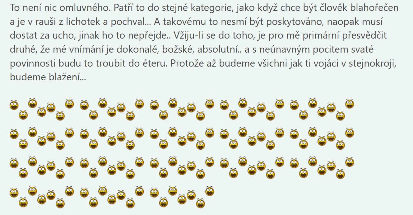 Skutečnost píše:Zkusím k tomu něco napsat někdy v noci (asi to bude delší), protože to co popisuješ, popisuješ ve skutečnosti stále z pohledu oddělené entity.