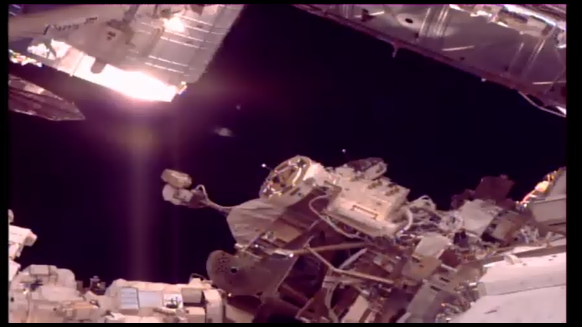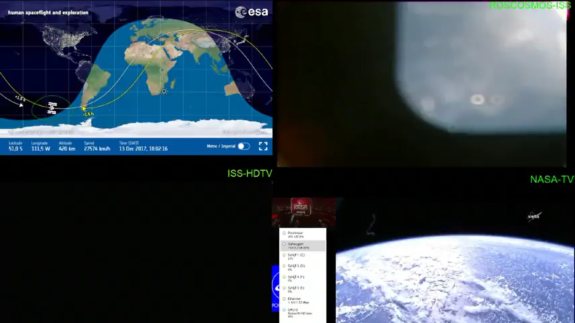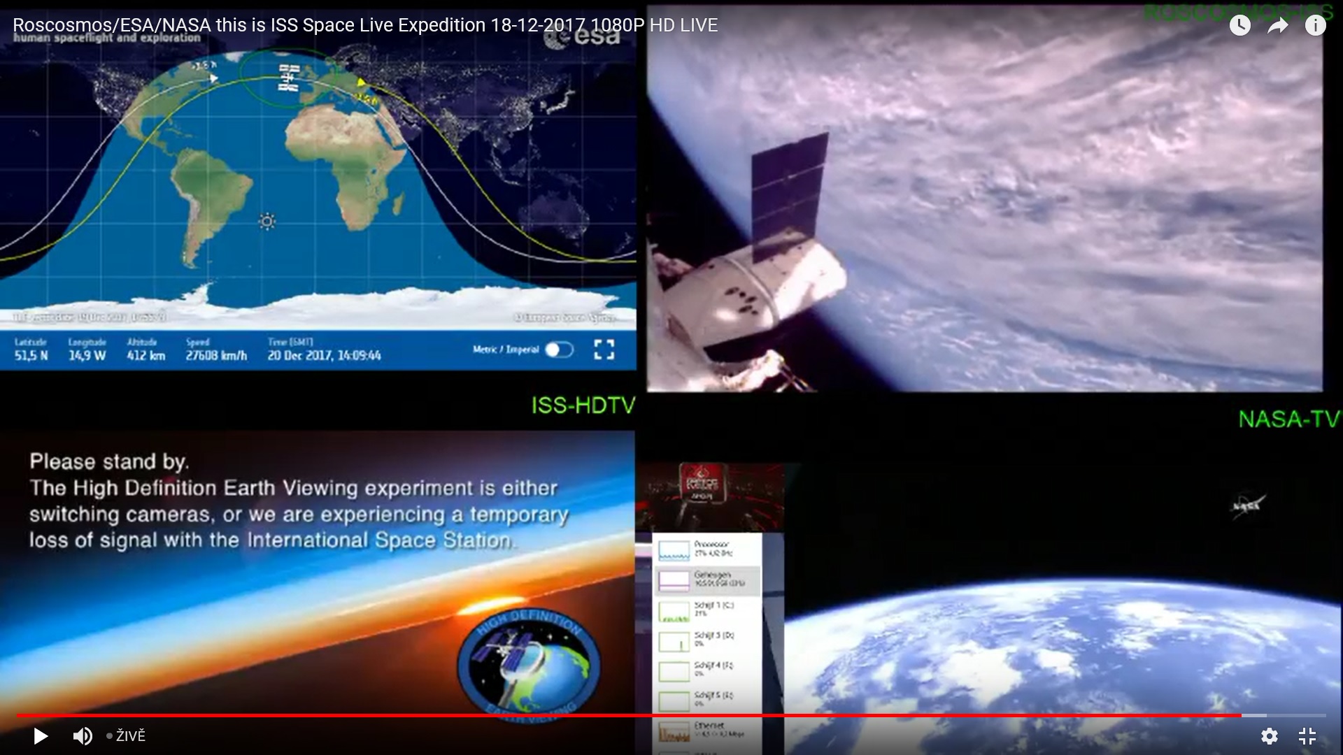 20.12.2017...v 15.09.44....před chvílí...cosi rychle proletělo kolem ISS...na lesklém povrchu stanice se cosi svítícího odráželo....nějaký oválný disk..... :lol:
