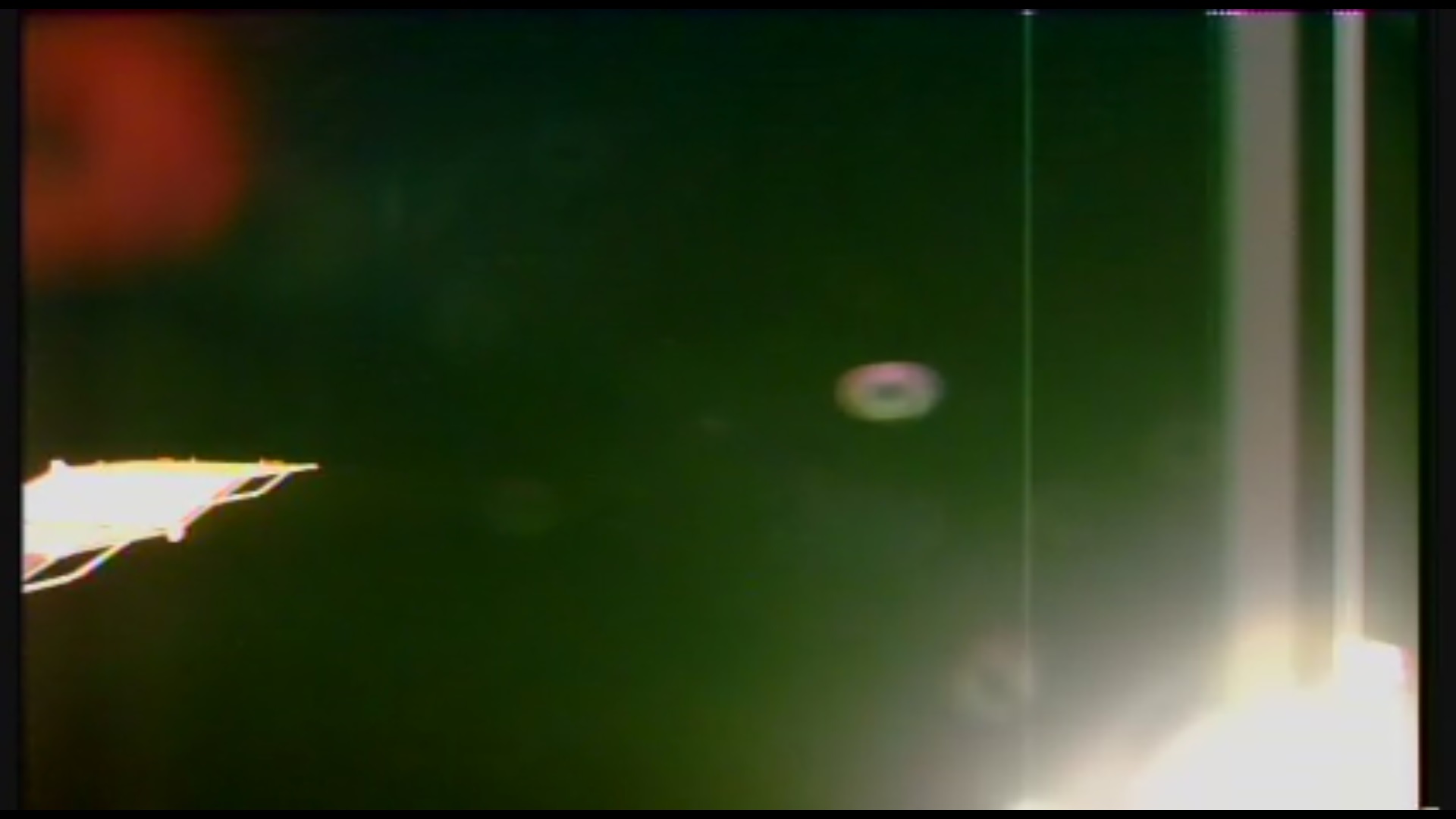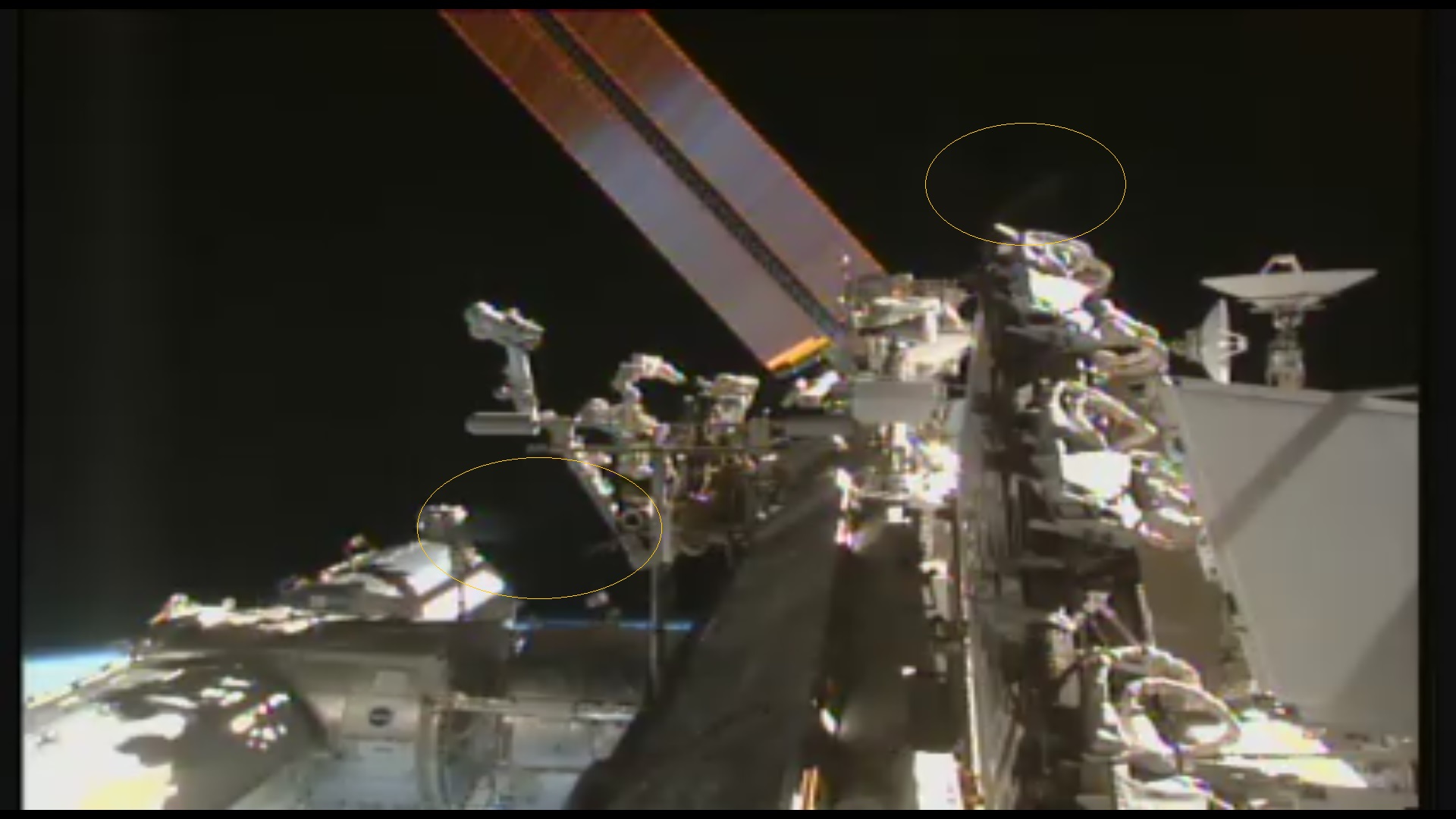 ISS - 21.12.2015 - 11,26 hod......kamera se najednou začala otáčet a sledovat mlžný obláček ....nakonec jich bylo více kousků....označeno žlutými oválky, aby jste je nemuseli hledat na fotce....... :meditace: