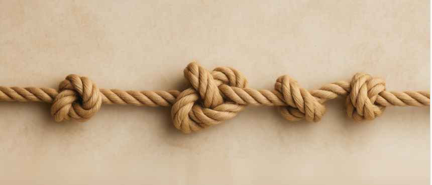 Tady je obrázek, který vizuálně ztvárňuje krásné přirovnání Míly Tomášové: provaz jako jednota Bytí, uzly jako iluze oddělenosti. Je klidný, jednoduchý a symbolický—provaz se táhne v jednotě, zatímco uzly se objevují jako dočasné formy, které nikdy neporuší samotnou podstatu.