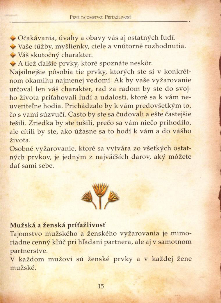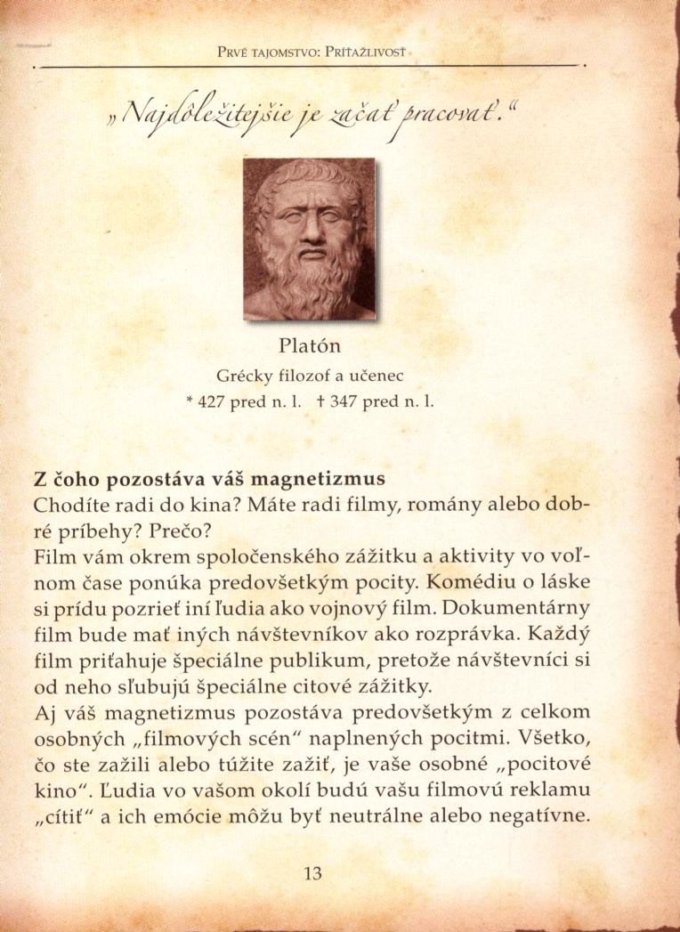 Ukážka textu z knihyNič v živote nie je náhoda Ľudia a príhody v našom živote sa neobjavujú náhodou. To, ako jednotlivé vzťahy vznikajú a vyvíjajú sa, nemá nič spoločného so šťastím alebo so smolou. Príčinou všetkého, čo sa v nás odohráva, je určitá sila. Tá spája nás všetkých. Má vplyv na to, či jeden druhého nájdeme, alebo nie. Je pôvodcom toho, čo cítime a ako sa správame. A rozhoduje o tom, či vznikne láska. Keď tejto sile porozumieme a vedome ju formujeme, bude v našom živote priťahovať presne tých ľudí a javy, po ktorých túžime.
