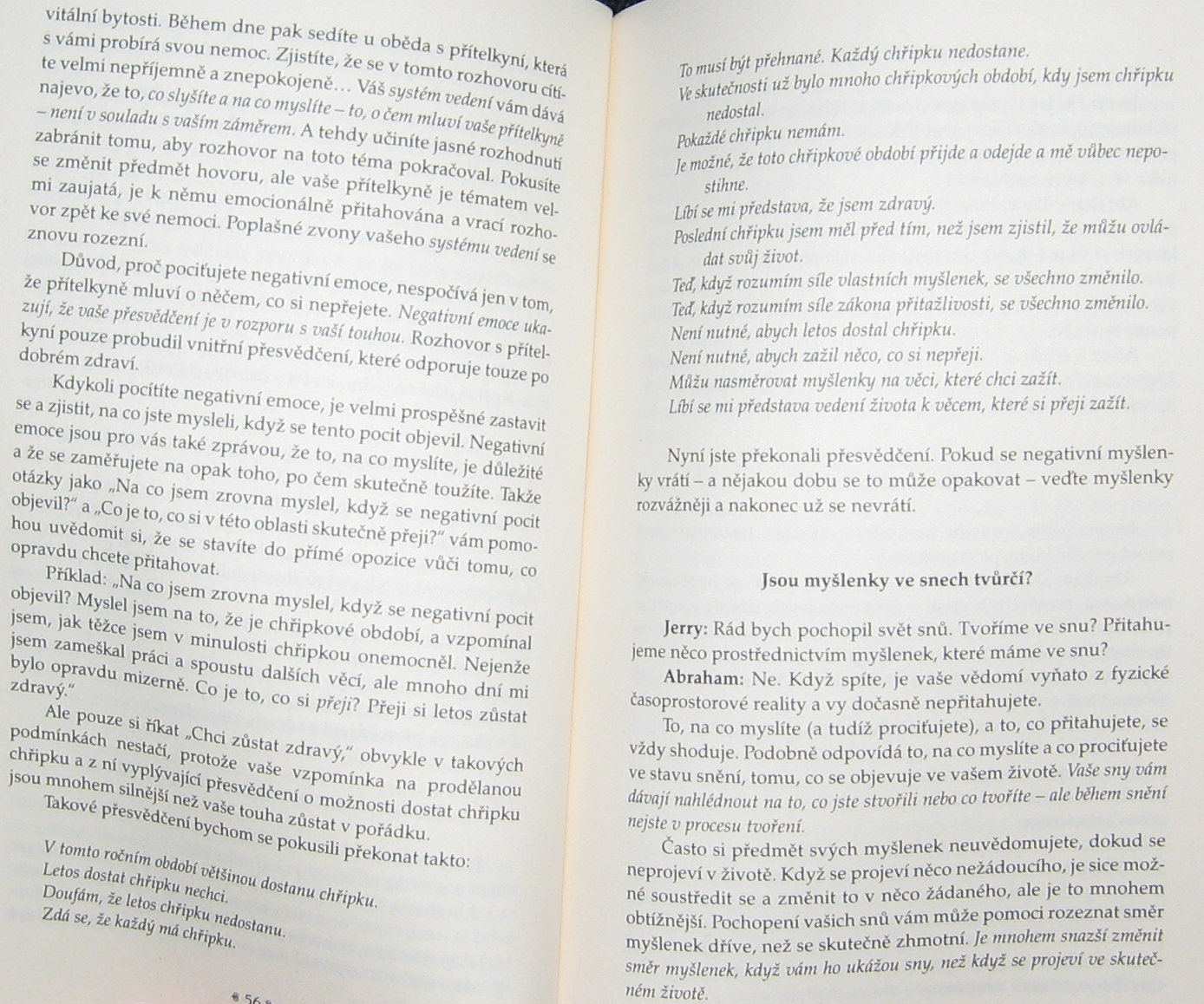 peto píše:....Len aj tu by som chcel podotknut, ze Abraham casto hovori len o priamej sugescii tej ci onej choroby, napr. ako v tomto pripade chripky. No clovek moze dostat chorobu, o ktorej v zivote nepocul a a ani na nu nemyslel, cize musia tam byt prepojene tie emocie s roznymi druhmi ochorenia, resp. s pocitmi, ake pocitujeme pri tom ochoreni.