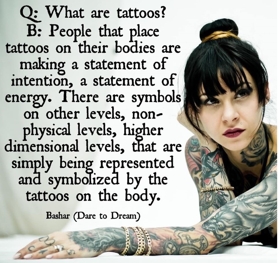 Bashar: Lidé, kteří umísťují tetování na svá těla, tím dělají prohlášení o záměru, prohlášení o energii. Jsou to symboly na jiných úrovních, nefyzické úrovně, vyšší dimenzionální úrovně, které jsou jednoduše reprezentovány a symbolizovány tetováním na jejich tělech.